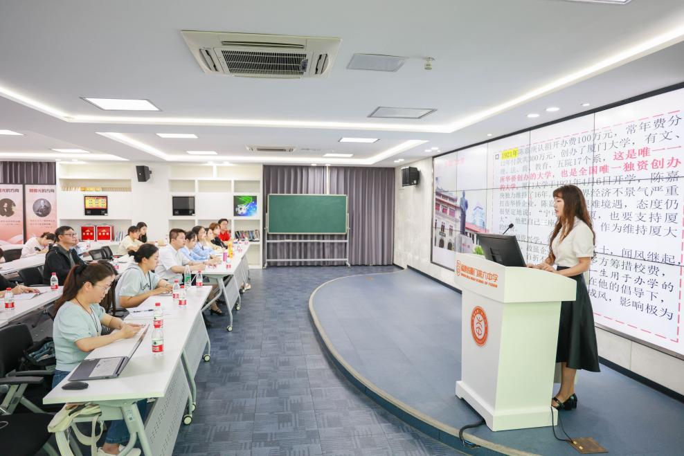 在教学展示环节中,六中高中部潘虹虹老师、六中初中部温馥榕老师、故宫小学林赐红老师分别以“嘉庚精神百年与时进”“华侨旗帜如何燃起民族之光”“华侨旗帜,民族光辉”为主题,结合不同学段课程特点和教学实际进行了说播课展示。思想政治教育教工党支部指导的博士研究生王艳茹以“弘扬嘉庚精神,逐梦强国复兴”为主题,结合嘉庚精神与厦大文化进行了高校思政课说播课展示。展示教师立足课程教材、结合教情学情,深度挖掘嘉庚精神的教育资源,将爱国主义教育内容融入课题内容、贯穿教学全程,教学环节设计巧妙,授课案例丰富新鲜,带来了一堂堂精彩纷呈的教学展示。