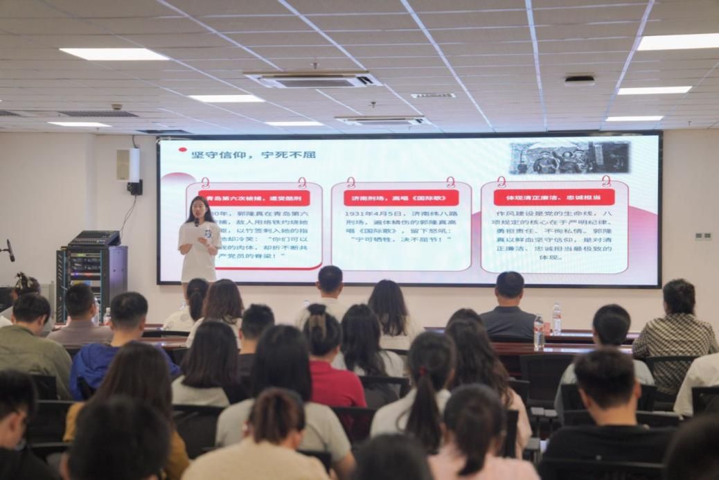 宣讲环节中,第一党支部党员凌泉灵以《郭隆真:以信仰为炬,以纪律为刃》为题,深情讲述了中国共产党早期革命家郭隆真冲破封建枷锁、投身革命斗争的光辉事迹。她通过郭隆真创办河北首所农村女校、领导“五四运动”、深入工人群体等生动事例,阐释了“青雁逐光”的深刻内涵,并联系中央八项规定精神,强调党员干部应以自我革命精神修身律己,在基层实践中弘扬清正廉洁、脚踏实地的作风。