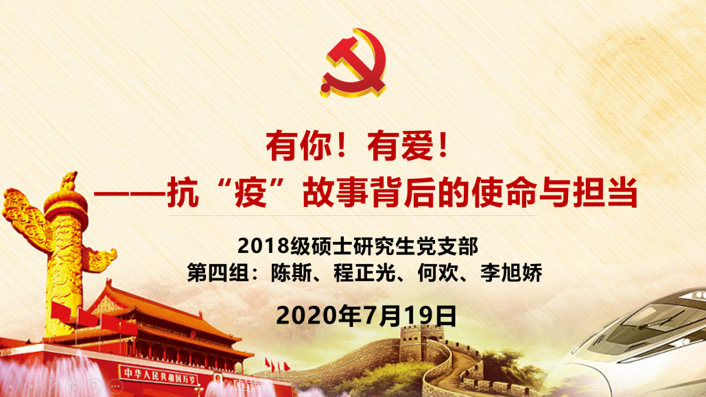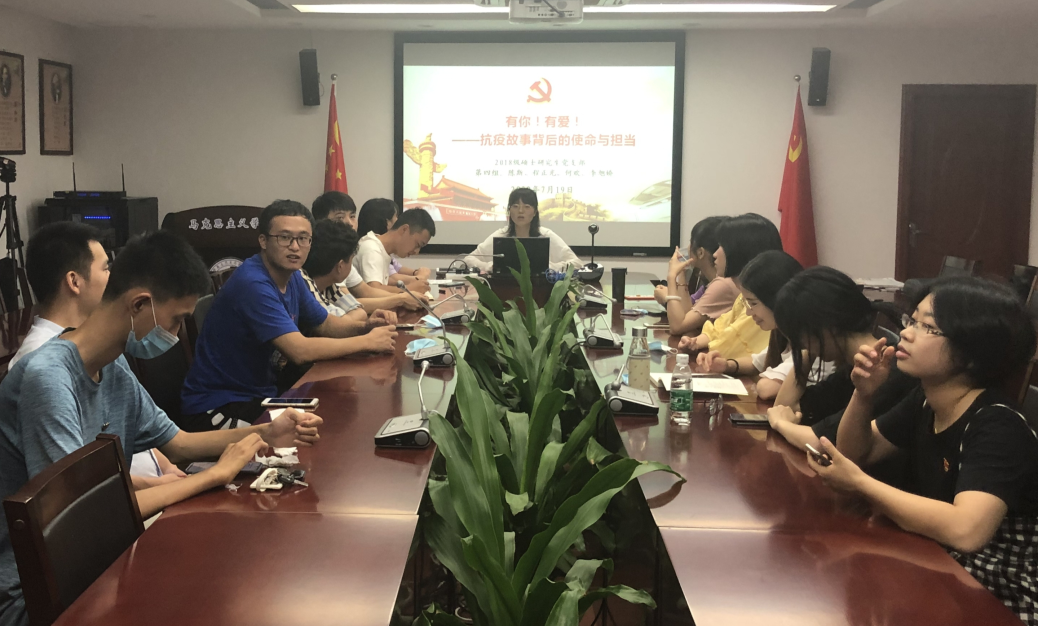 7月19日,2018级硕士研究生党支部在囊萤楼302会议室召开主题为“有你!有爱!——抗疫故事背后的使命与担当”战“疫”微党课。党课由陈斯、何欢两位同志主讲,支部在校党员和部分入党积极分子参与了此次活动。
