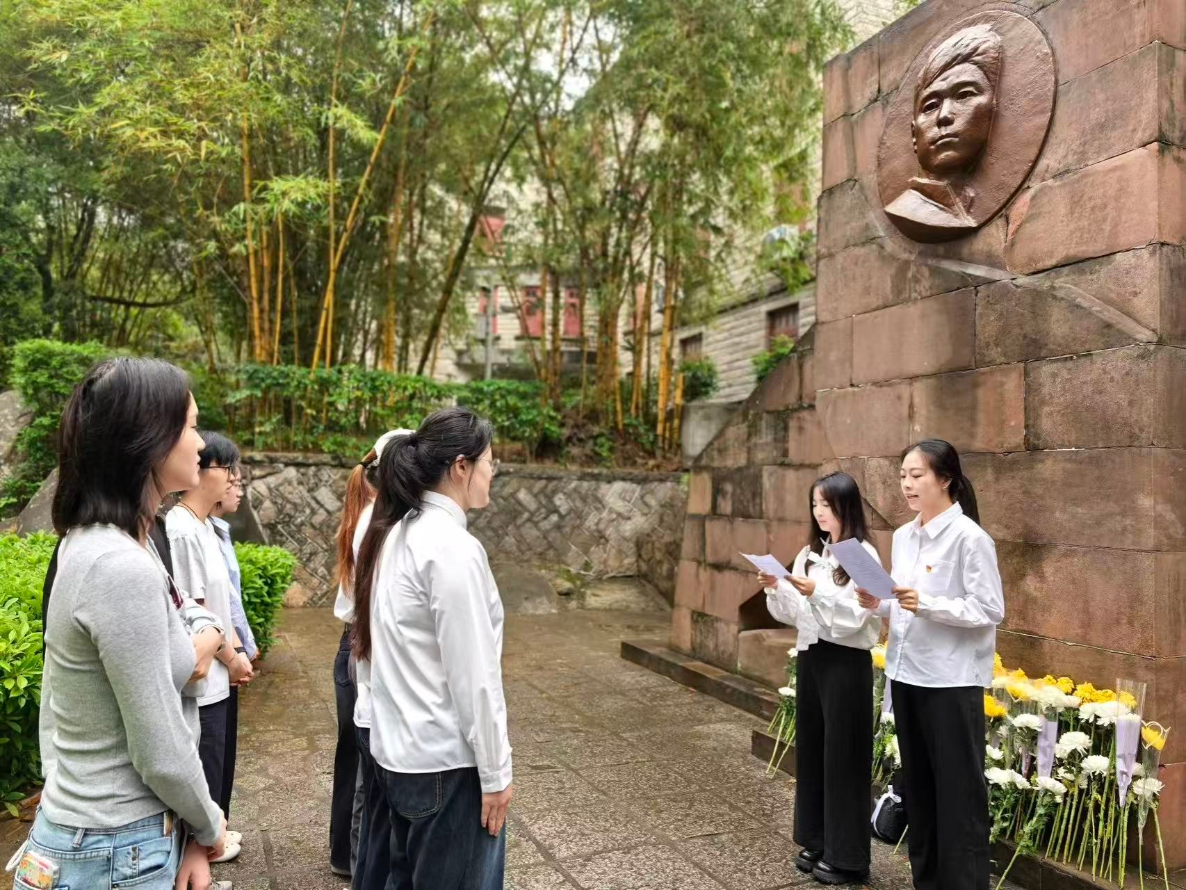 春雨如丝,烈士陵园松柏苍翠,气氛庄严肃穆。支部书记许雪倩向党员们介绍了罗扬才烈士的光辉事迹和厦大党组织的发展历程。随后,党员们向罗扬才烈士雕像行默哀礼,深切缅怀革命先烈的崇高精神。