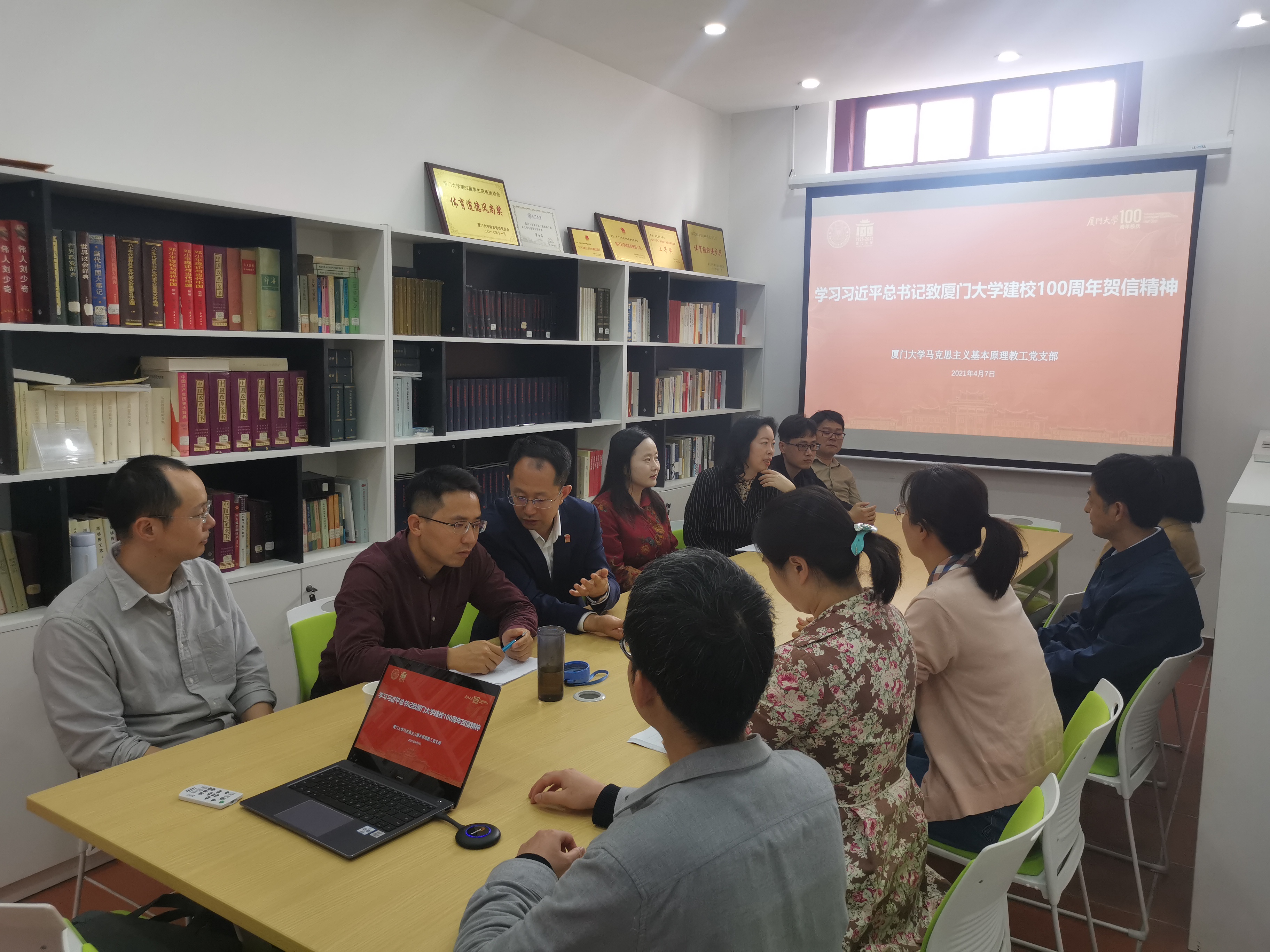 4月7日下午,马克思主义基本原理教工党支部开展主题学习活动,集体学习习近平总书记致厦门大学建校100周年贺信精神。就在前一天,适逢厦门大学百年校庆,习近平总书记专门致信祝贺,表达了对厦门大学的高度肯定和深深期许,让厦大师生倍感振奋鼓舞。