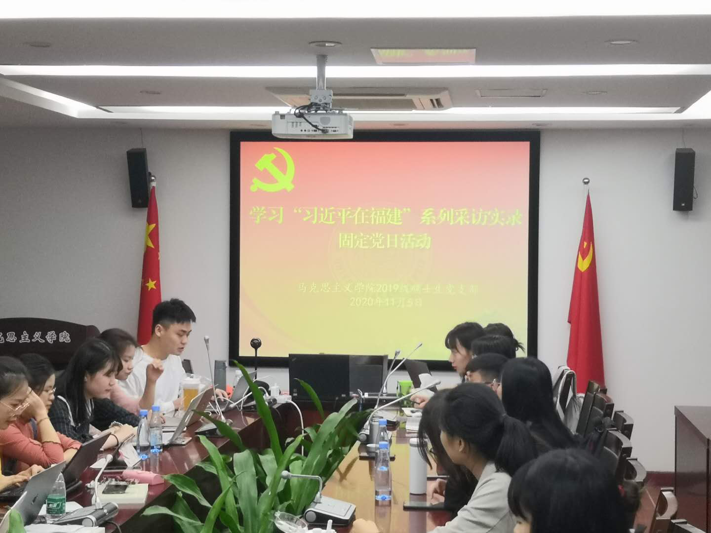 为进一步理解和秉承习近平总书记在福建工作时创造的宝贵思想财富、精神财富、作风财富和实践成果,11月5日,马克思主义学院2019级硕士研究生党支部在囊萤楼302会议室开展固定党日活动,学习“习近平在福建”系列采访实录。