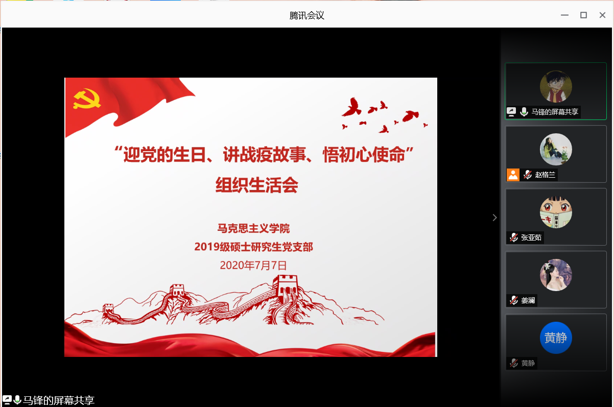 7月7日,积极响应学校在常态化疫情防控中加强基层党建“四个一”行动的号召,我院2019级硕士研究生党支部召开“迎党的生日、讲战疫故事、悟初心使命”专题组织生活会。由于疫情原因,本次组织生活会采用线上方式。会议由支部书记马锋主持,支部全体党员参加了会议。