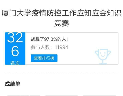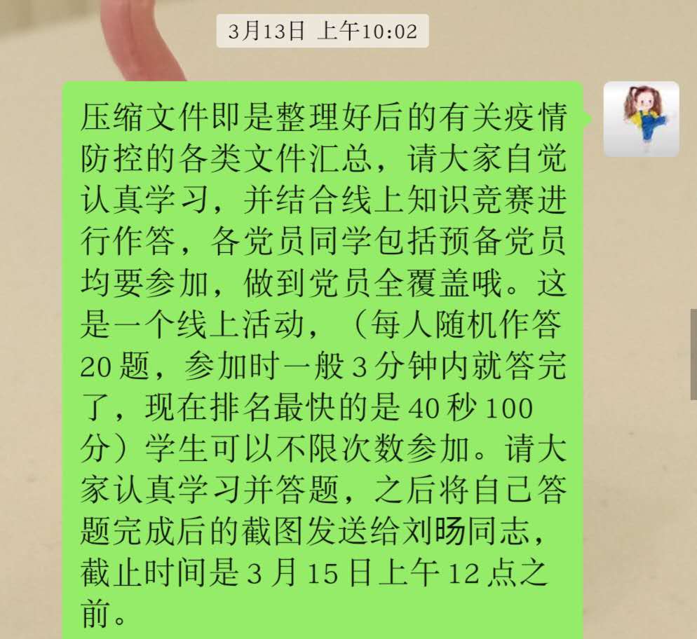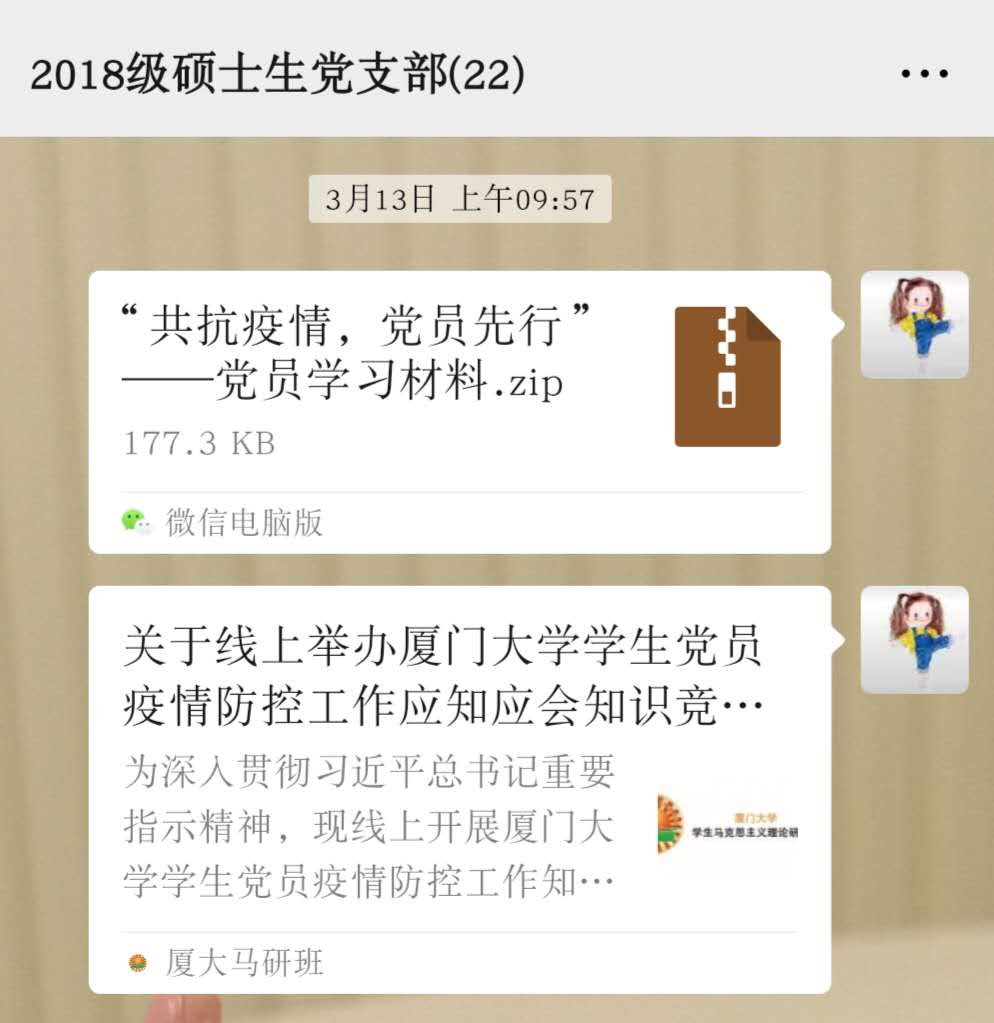 为深入贯彻习近平总书记重要指示精神,认真学习落实党中央、国务院有关疫情防控工作部署,响应中共厦门大学委员会党的建设工作办公室等部门的号召,我院2018级硕士研究生党支部于2020年3月13日-3月15日结合厦门大学学生马克思主义理论研修班“关于线上举办厦门大学学生党员疫情防控工作应知应会知识竞赛的通知”,向大家分享了相关的赛前文件和视频学习资料,通知并督促党员同志们积极响应活动安排,全面参与到学生党员疫情防控工作应知应会知识竞赛活动中。