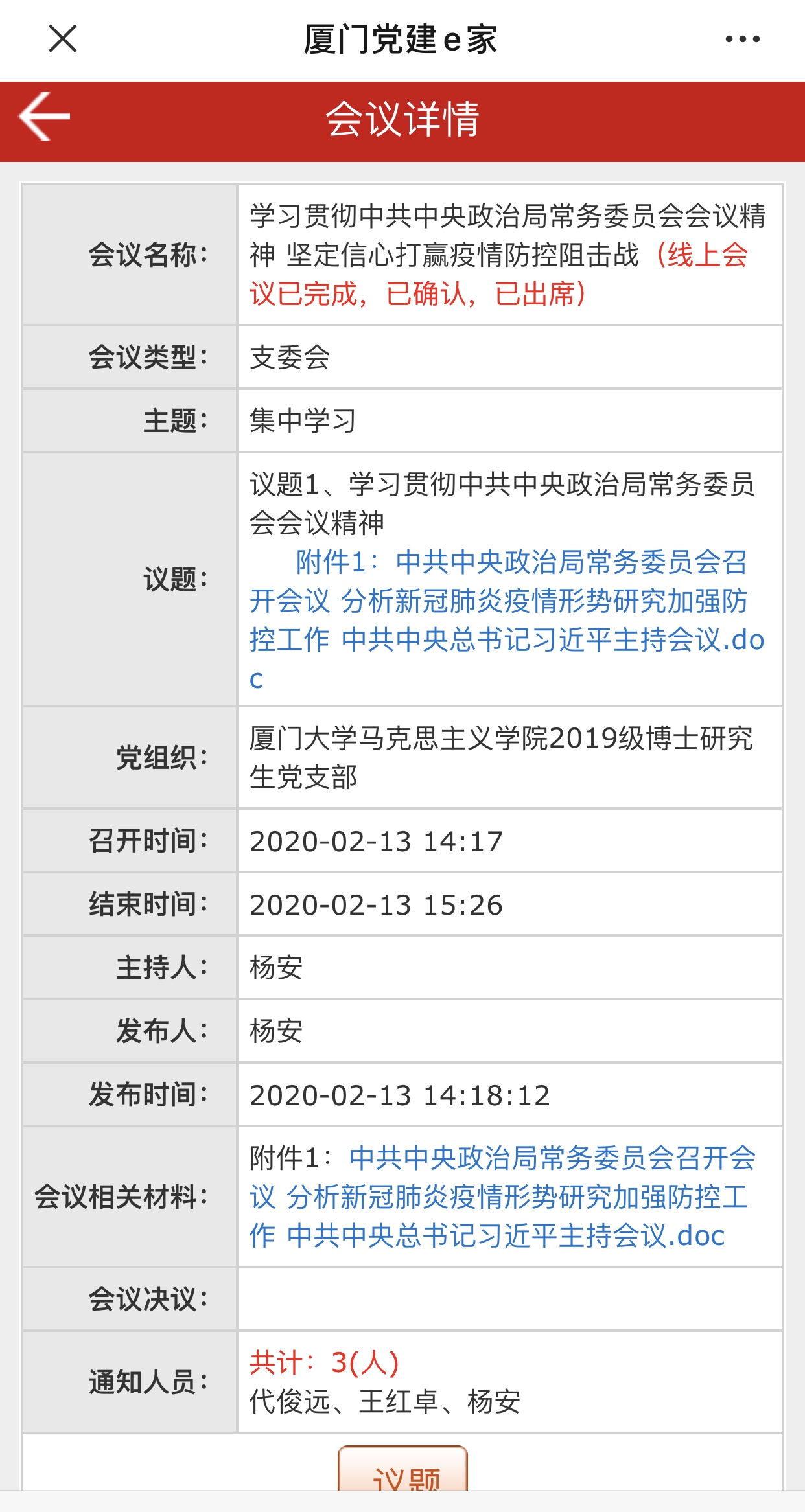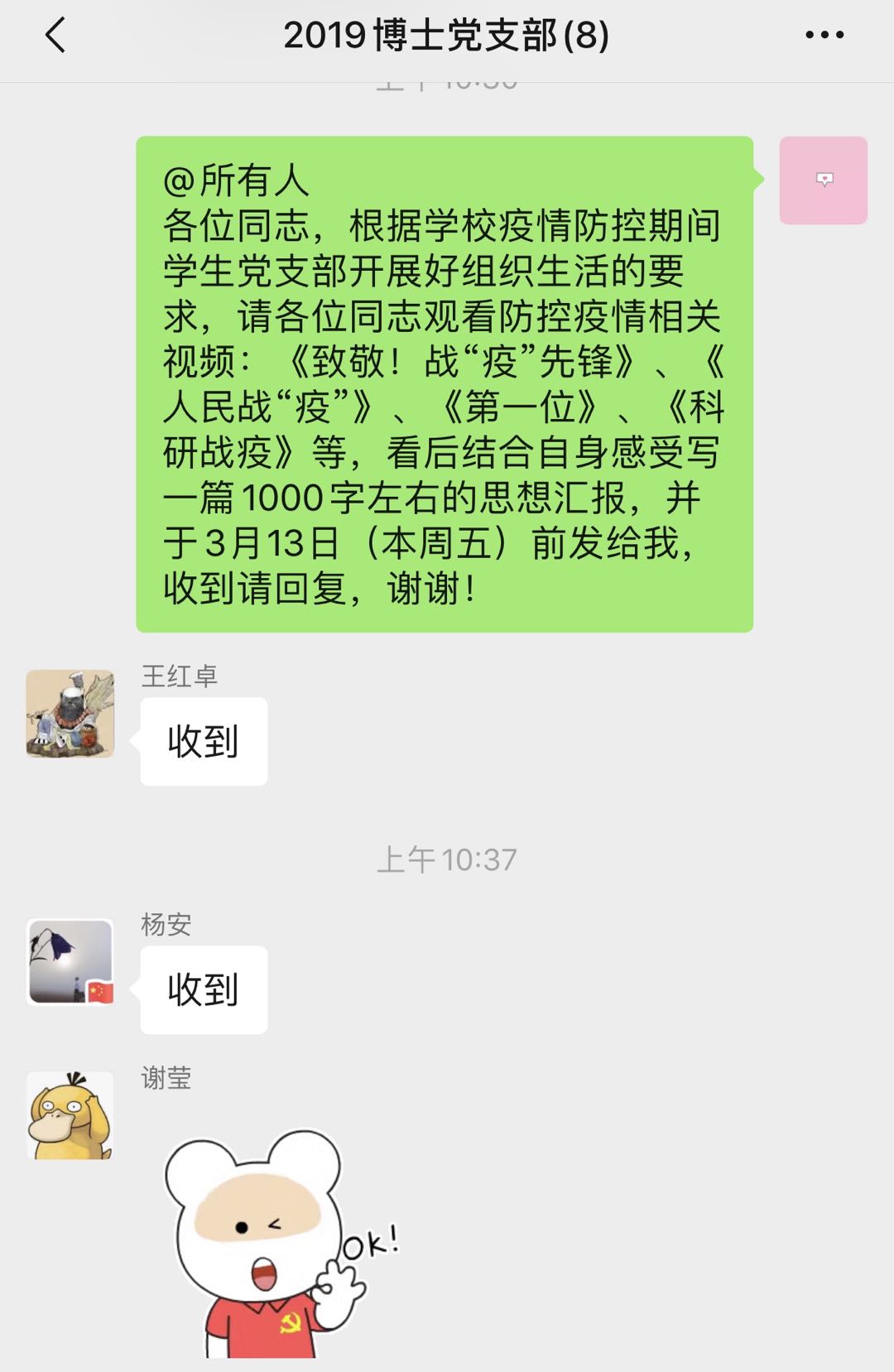 新冠病毒肆虐全国,在学院党委的领导和院团委指导下,2019级博士党支部结合自身实际,采取线下学习、线上交流的方式加强本支部党员组织生活学习。疫情不退,学习不减。