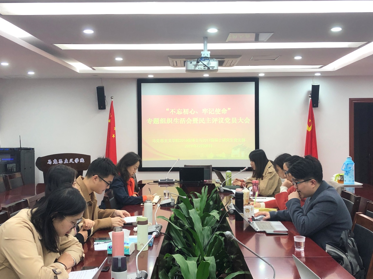 根据学校、学院党委关于召开“不忘初心、牢记使命”基层党支部专题组织生活会和开展民主评议党员工作的相关部署,2019年12月8日上午,我院2016级博士与2017级硕士研究生党支部全体成员,在囊萤楼302召开“不忘初心、牢记使命”专题组织生活会暨民主评议党员大会。马克思主义学院党委副书记原宗丽出席会议并进行指导,此次会议由支部书记林丹主持。
