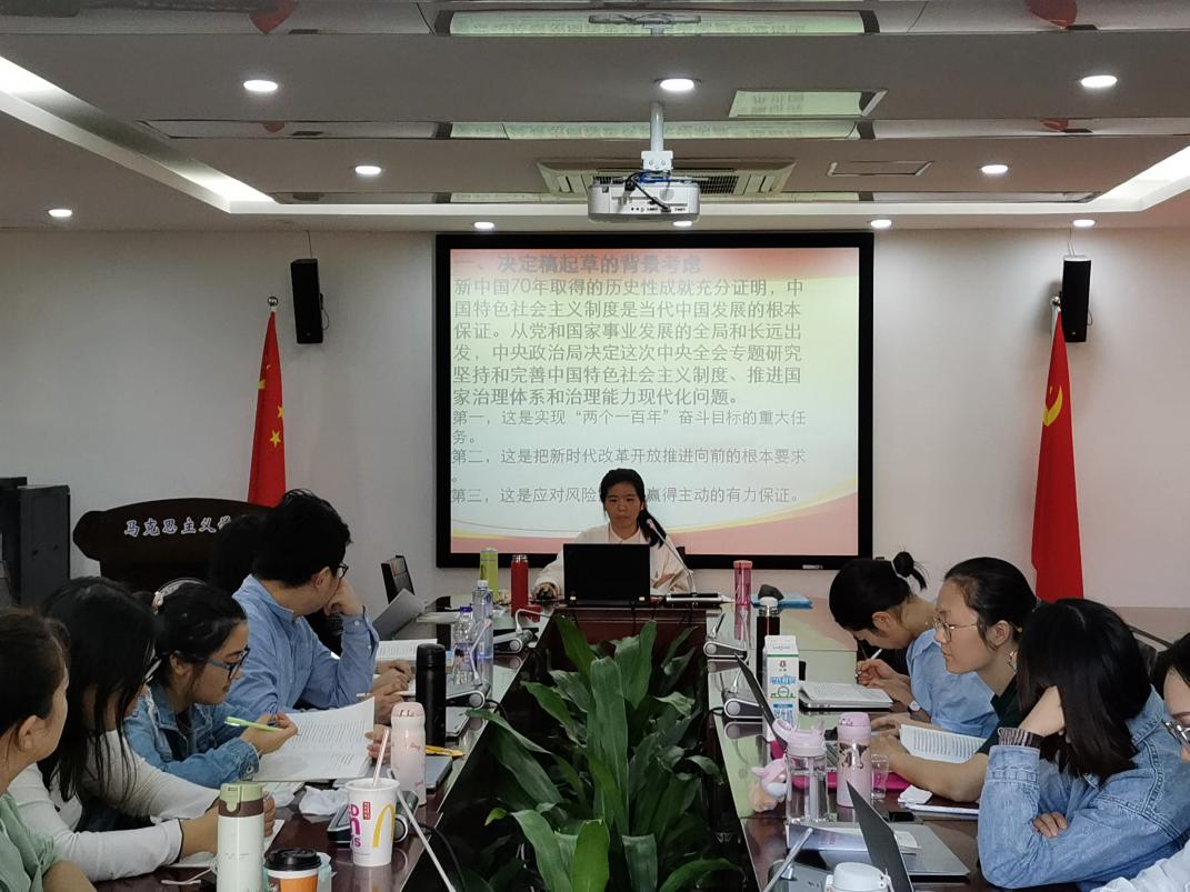 同日下午,2016级博士与2017级硕士研究生党支部集中学习党的十九届四中全会精神。由党支部组织委员满童童作党的十九届四中全会精神导学报告,全体党员就《中共中央关于坚持和完善中国特色社会主义制度、推进国家治理体系和治理能力现代化若干重大问题的决定》展开集体学习研讨。党的十九届四中全会精神内涵丰富、意蕴深刻,蕴含着“中国之治”的大逻辑、大智慧,会后支部党员将继续深入学习领会全会精神,原原本本学、结合实际学,以切实增强“四个意识”、坚定“四个自信”、做到“两个维护”。