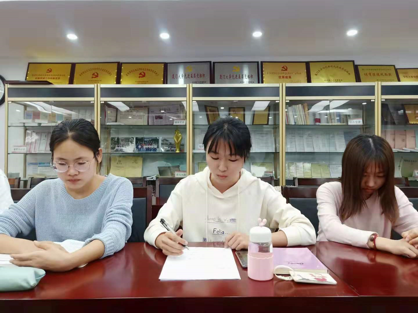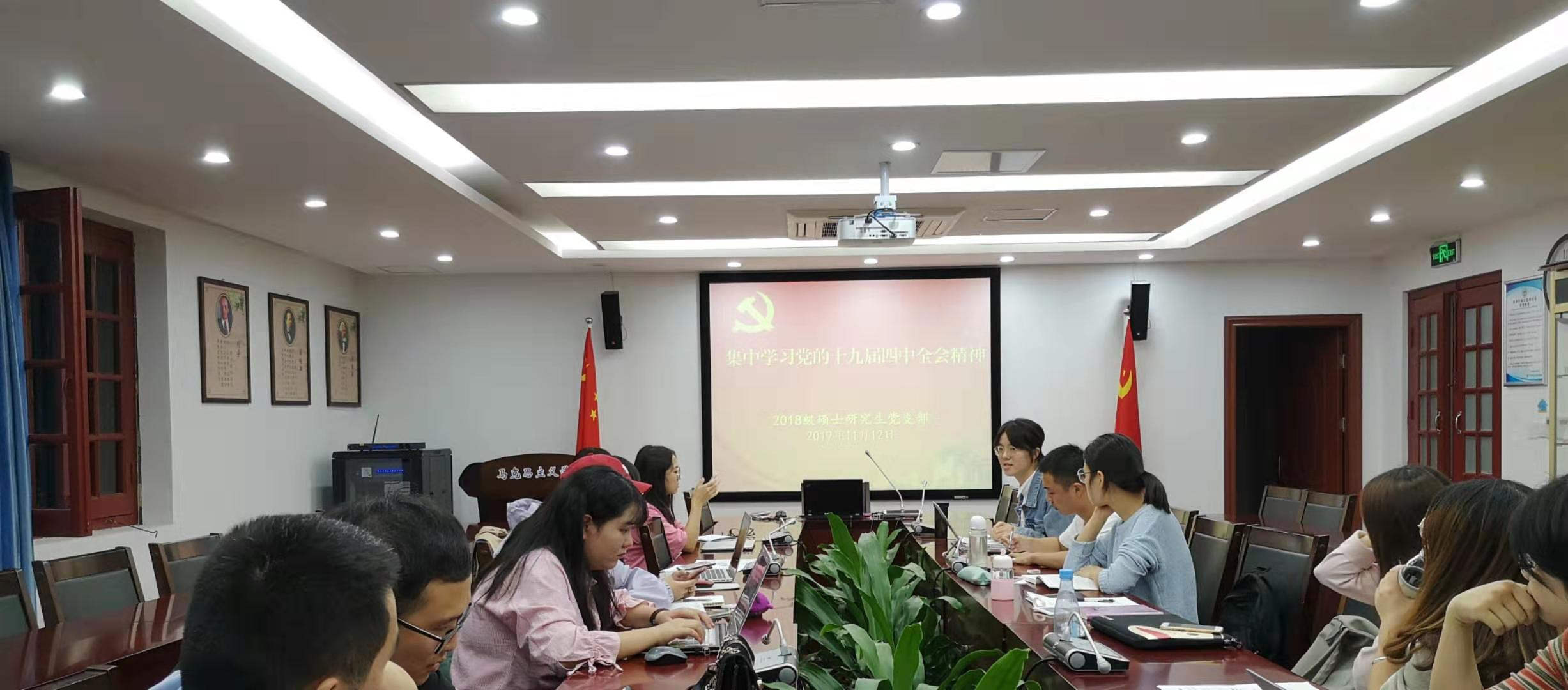 2019年11月12日晚,2018级硕士研究生党支部在囊萤楼302会议室开展有关党的十九届四中全会的集中研习活动,会上大家重点学习了党的十九届四中全会通过的《中共中央关于坚持和完善中国特色社会主义制度、推进国家治理体系和治理能力现代化若干重大问题的决定》的相关内容,并积极交流各自的学习心得。