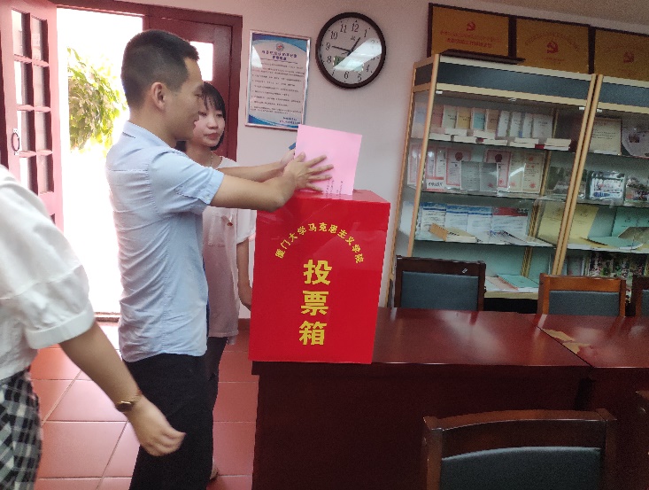 听取工作报告后,与会党员举手表决通过了选举办法及监票人、计票人建议名单,一致通过王思婷同志为监票人,吴丽丽、舒丹翎两位同志为计票人。在充分酝酿下届支部委员会候选人的基础上,与会党员怀着对党支部工作和未来发展的高度责任感,以无记名投票、差额选举的方式庄严地投下了自己神圣的一票。选举产生了由陈斯、刘旸、傅佳薇等三名同志组成的新一届党支部委员会。