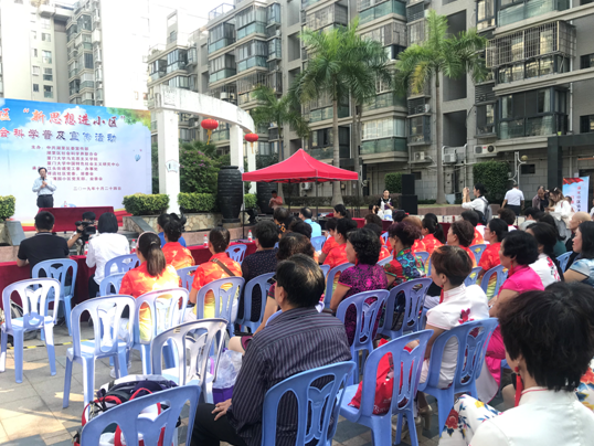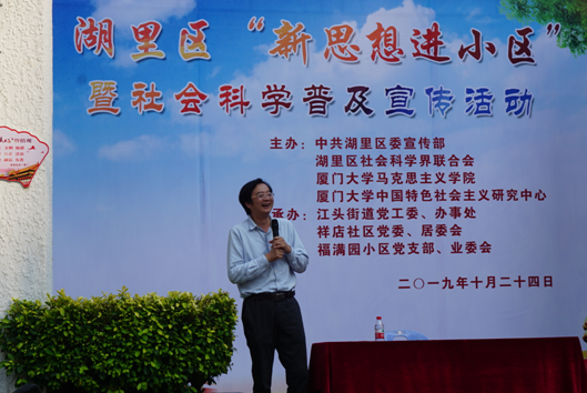 2019年10月24日下午,我院马克思主义中国化教工党支部组织的“新思想进小区”主题宣讲活动在江头街道祥店社区福满园小区顺利开展。支部特邀厦门大学经济学院财政系刘晔教授作为宣讲专家,为小区居民讲授“新时代财政与民生”,宣讲团成员还有博士生陈书平、刘进龙、吕政龙等。厦门市湖里区委常委、宣传部部长丁红斌、区社科联主席文国清、江头街道办事处主任曾以勤、祥店社区党委书记谭琼兰及社区居民60余人参加了此次宣讲活动。
