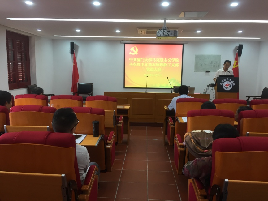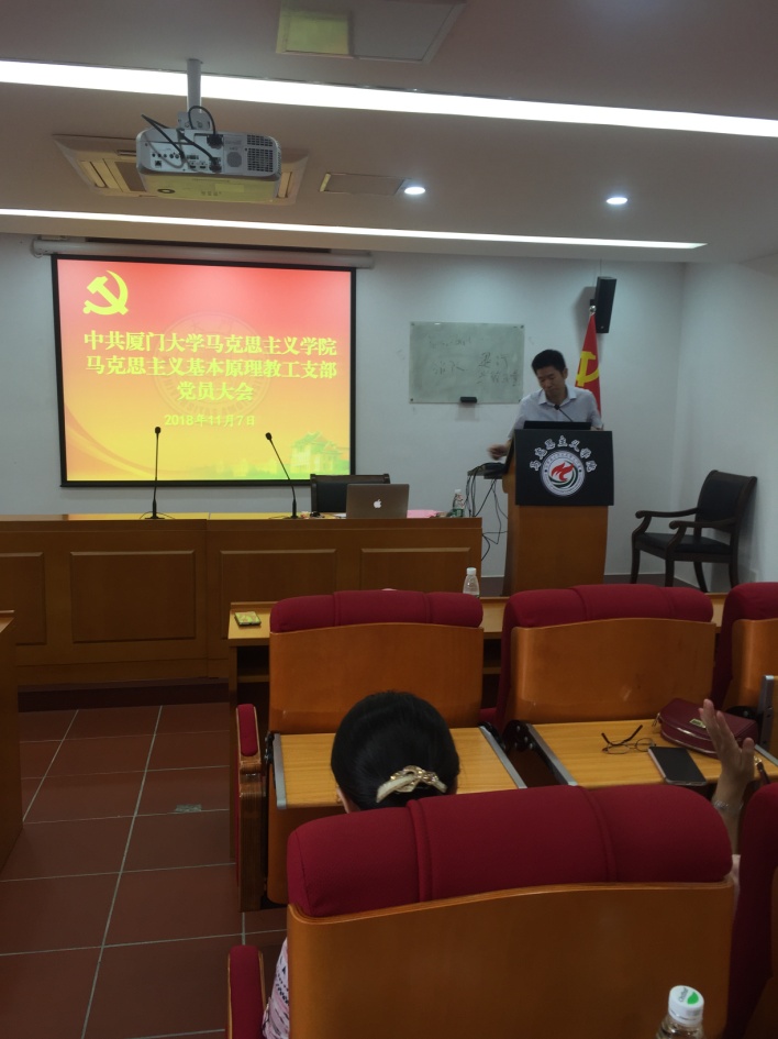 会议在国歌声中拉开序幕。支部宣传委员黄莹主持会议,并代表本届支部委员会作《中国共产党厦门大学马克思主义学院马克思主义基本原理教工党支部委员会工作报告》,经全体党员一致表决通过。之后,会议严格按照组织程序,进行支部委员会换届选举,根据无记名投票结果,张艳涛、李猛、傅丽芬、李仙飞当选为支部委员。紧接着,支部委员会召开了第一次全体会议选举书记、副书记,张艳涛同志、李猛同志分别当选为党支部书记、副书记。