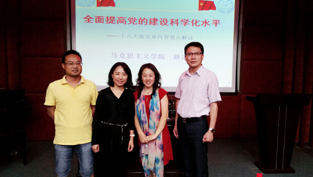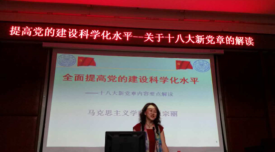 5月24日晚,为全面落实“两学一做”精神,人文学院为全体毕业班党员开展了题为《提高党的建设科学化水平——关于党的十八大新党章的解读》的讲座。讲座于人文学院101报告厅举行,邀请马克思主义学院原宗丽副教授主讲。人文学院党委副书记王瑛慧、李启忠,团委副书记谢斌剑出席讲座。此次活动是人文学院“两学一做”工作的重要组成部分,旨在让毕业班党员在离校之前,进一步增强理论修养,学习党章、熟读党章,坚定理想信念,以坚实过硬的政治素养为毕业后奉献社会保驾护航。