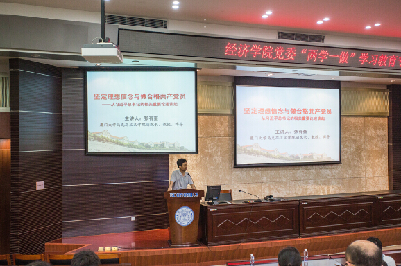 张有奎以《坚定理想信念与做合格共产党员——从习近平总书记的相关重要论述谈起》为题,从习近平总书记关于坚定理想信念的相关重要论述入手,从历史的角度阐述坚定理想信念的重要性。之后,他从“理想信念的现状和问题”、“做合格共产党员,坚定理想信念的原则和方法”、“做合格共产党员,坚定理想信念的若干热点问题”等三方面解读了习近平总书记强调的“革命理想高于天”、“理想信念就是共产党人精神上的‘钙’,没有理想信念,理想信念不坚定,精神上就会‘缺钙’,就会得‘软骨病’”等重要论述。最后,张教授结合“两学一做”学习教育,指出学习教育的关键在做,不能搞形式主义,要真学、真懂、真信、真用。
