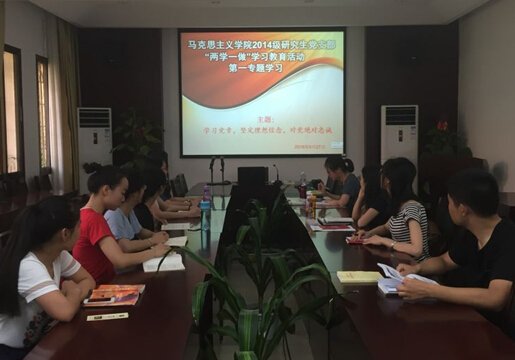 2016年5月27日,2014级研究生党支部在学院110开展了“两学一做”第一专题学习教育。此次活动的主题为“学习党章、坚定党员信念、对党绝对忠诚”,主讲人为蔡丽娟、林雅玲、杨海阔和黄秋萍。