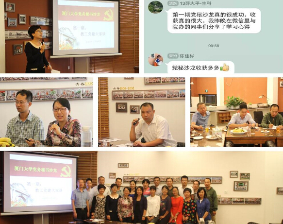 据悉,校党委组织部按照新时期高校党建工作新要求,深入践行“三严三实”,切实加强党务秘书队伍建设,以厦门大学党务秘书沙龙为载体,为党务秘书打造一个开放性、研究型的交流平台,引导党务秘书积极研修理论、努力提高业务、相互交流经验、共享党建成果,推动党务秘书队伍专业化、精致化发展。本期沙龙由化学化工学院、物理与机电工程学院、艺术学院、材料学院4个学院共同策划并承办,之后将继续采取校党委组织部指导下若干学院(单位)联合承办的方式常态化开展下去,切实把党务秘书沙龙自主学习交流、培训锻炼干部的作用落到实处。