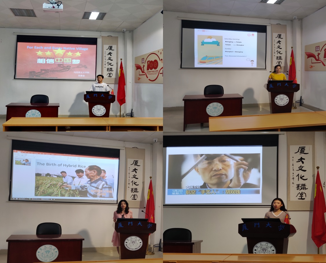 在英文故事展示中,四组同学分别围绕“希望之光”、“大国工程”、“一生逐梦”、“红色工匠”四大主题进行故事讲述。吴春金带领大家回顾了教育工作者王小平远赴湖北省利川开设拓展课程——“钟灵课程”的事迹,使大家不仅感受到了多种课程教育对大山孩子的重要意义,更对于王小平的人师精神产生了由衷的敬佩。黄相宜激情讲述了中国高铁给人们生活带来的一系列重大改变。从“中国第一”到“世界第一”,在呼啸前进的高铁列车中,一个充满发展活力的流动中国正在带领中国人民奔腾向前。“一辈子躬耕田野,脚踏实地把科技论文写在祖国大地上”。这是对袁隆平院士一生的最真实写照。马诗晴对袁老一生为国为民的付出与奉献进行了细致的刻画与描述,将本场故事会的气氛推向了又一个高潮。之后,在李涵的带领下,全体同学对于胡双钱“匠心筑梦中国大飞机”的故事有了更深的感悟和体会。正是有无数像胡双钱一样的伟大工匠数十年如一日地追求着职业技能的极致化,我国才能在各项事业中稳步前进、取得一个又一个令世界为之赞叹的辉煌成就。