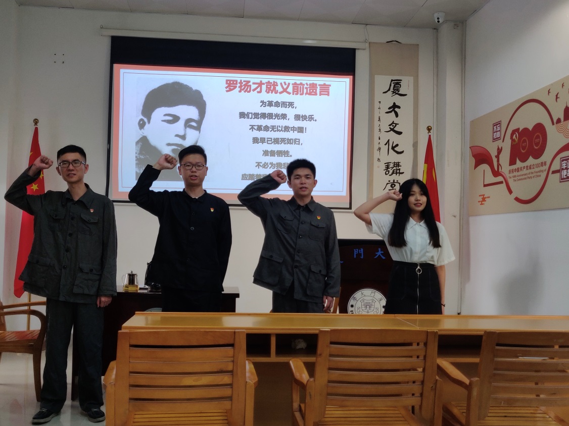 在中文故事展示环节,林超群、游志杰、连传钊、王玮妮率先登台,以情景演绎的方式再现了罗扬才同志在厦门大学建立党支部的画面。表演最后,四位同学以郑重的入党宣誓仪式,彰显新时代青年坚定理想信念、一心向党的精神,也激发在场每一位党员的自豪感和荣誉感。