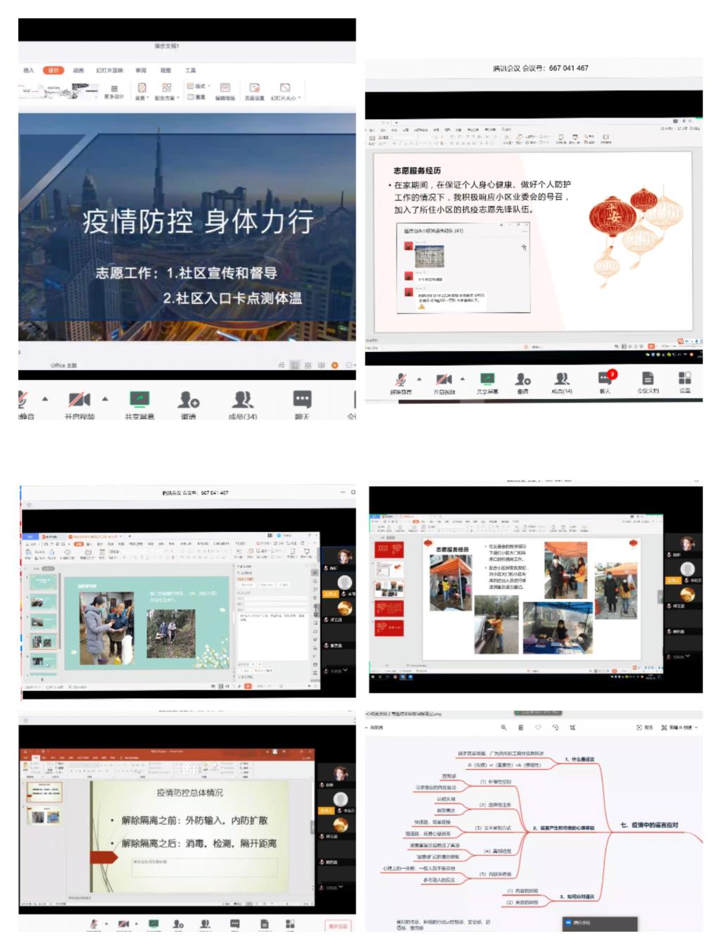 支部的其他同学在充分保证自身安全的基础上,还积极投身所在社区的疫情防控工作,用实际行动体现担当作为。在支部大会上,社区志愿者同学都纷纷讲述了自己服务经历。2018级硕士生蒋娇娇分享到自己在本村帮助填写疫情防控相关表格、入户排查村民身体状况、分发生活物资以及替学校分发教材等经历。程紫琪谈到自己在社区进行疫情防控知识的宣传,对不戴口罩、聚众娱乐等不文明的现象进行劝阻,并在社区入口处帮忙测量体温。苏心怡还结合学校对心理委员线上专题培训的部分内容,从什么是谣言、谣言产生和传播的心理基础、如何应对谣言三个方面与大家进行分享,增强了大家明辨谣言的能力。