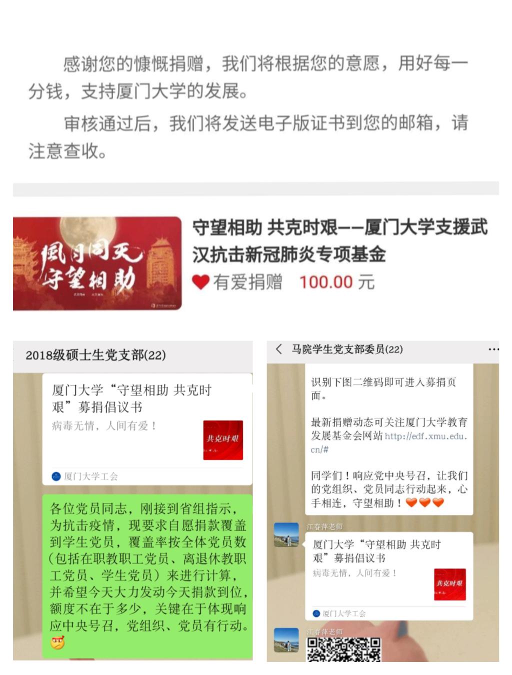 一方有难,八方支援。为响应以习近平同志为核心的党中央的号召,表达对武汉人民的热切关怀,学校向全校师生员工发出“守望相助 共克时艰”专项捐款倡议,鼓励全体厦大人以实际行动支持疫情防控工作。学院各学生党支部积极响应、迅速行动即时组织学生党员同志们进行爱心捐款活动。全院师生积极支持“守望相助 共克时艰”专项捐款,学生党员捐款率达到100%。党员同志们通过捐献一份爱心、贡献一份力量,用力所能及的方式来表达党员同志对战斗在最前线的医务工作者的崇高敬意,表达对疫区人民群众的支持和鼓励,用涓涓细流汇成奉献社会的浩浩江河,用点点善举集成心怀家国的大爱无疆。