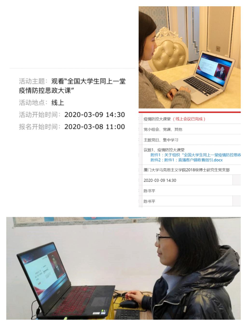 在充分学习的基础上,支部党员同志不仅利用线上平台进行即时心得分享,还以提交思想汇报的形式来检验学习成效。通过疫情在家自主学习的这段时间,每位同志都感受到防疫一线医护人员的辛苦付出,更加佩服这些新时代可爱的人,也意识到作为新时代的青年应该做力所能及的事为防控疫情贡献自己的力量。