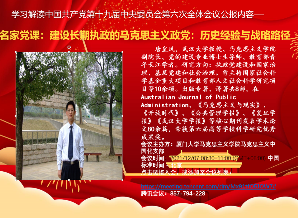 12月7日上午,马克思主义中国化教工党支部举办第二期“名家党课”,集体学习党的十九届六中全会公报精神。本次党课主题为《建设长期执政的马克思主义政党:历史经验和战略路径》,邀请到武汉大学马克思主义学院唐皇凤教授主讲。支部书记吴茜主持学习,中山大学教授、厦门大学兼职教授郭忠华对讲座内容进行了精彩的总结和点评。