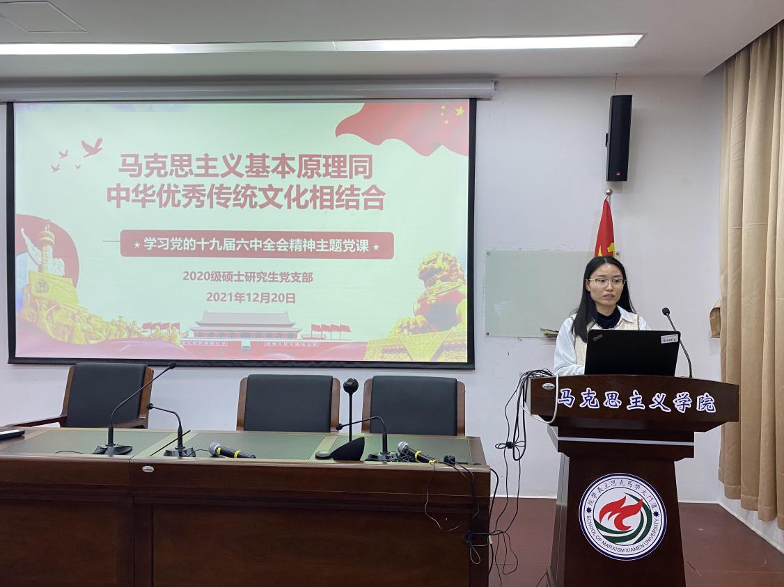 支部书记李路静结合习近平总书记在庆祝中国共产党成立100周年大会上的重要讲话,从“坚持马克思主义基本原理同中国具体实际相结合、同中华优秀传统文化相结合”这一重要论述出发,详细梳理、分析了二者足以结合的客观基础、理论品质、实践基础和主体条件。不忘本来才能开辟未来,善于继承才能更好创新,她认为,作为马克思主义理论专业研究生党员,站在新时代的历史起点上,推进马克思主义基本原理同中华优秀传统文化相结合,以时代精神激活中华优秀传统文化的生命力,使马克思主义在发展创新的过程中,通过与中华优秀传统文化的相融相通,日益彰显生命力。