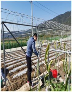 座谈会结束后,两个支部的全体党员来到三秀山蔬菜种植基地,实地考察明溪村“美丽乡村”建设成就。三秀山蔬菜专业合作社以“合作组织+公司+农户”的市场经济运营模式,积极为菜农提供产前产中产后服务,组织菜农开展订单生产,促进农户增加收入,使村民幸福感、获得感与日俱增。两个支部的党员们踊跃下到田间地里干农活,亲手协助村民浇地、喂牛,采摘菜瓜、玉米、辣椒,感受农民劳动的艰辛与收获的喜悦。
