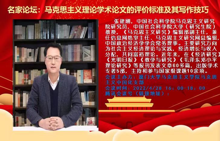 4月28日下午,为了提升支部教工党员的学科素养、学术能力、科研写作水平,马克思主义中国化教工党支部举办名家讲坛云上讲座,邀请到中国社会科学院马克思主义研究院研究员、中国社会科学院大学(研究生院)教授、《马克思主义研究》编辑部副主任张建刚教授来指导党员关于马克思主义理论学术论文写作技巧和方法。讲座由党支部书记吴茜主持,马克思主义中国化教工支部全体党员和马克思主义学院博士生研究生各支部党员80余人共同参加此次活动。