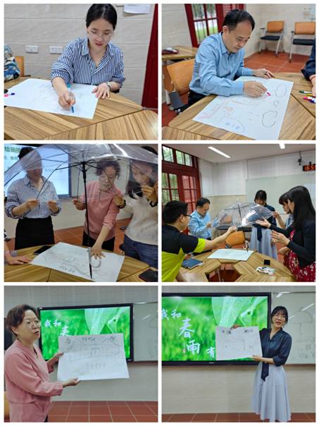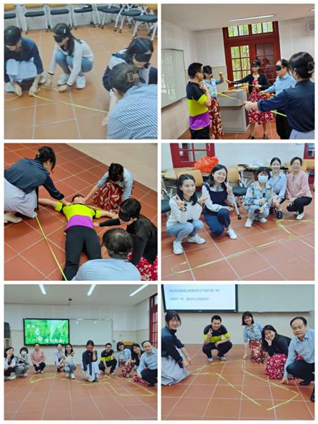接下来,根据对雨声的描述分类,十位老师被分成两个小组。小组成员分别戴上眼罩,通过团队协作用绳子在地上组成不同的雨具图案。两个小组在精诚的团队合作和默契的小组配合中分别完成了任务。紧接着,任务升级,所有人需要再次戴上眼罩,将刚才组成的两个雨具图案,变成一个大的组合图形。两个小组在原有分工安排的基础上,讨论出了合并图案的配合方案,圆满完成了组合任务。