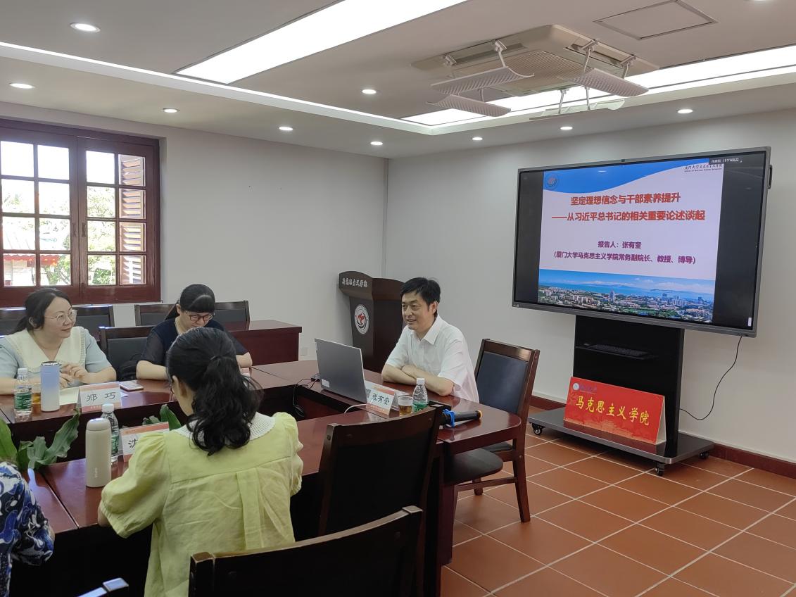 张有奎对闽江学院马克思主义学院同行的到访表示欢迎。随后,张有奎作《坚定理想信念与干部素养提升——从习近平总书记的相关重要论述谈起》专题讲座。他指出,党员干部要坚定理想信念,注重学习提高,不断开阔工作思路、增强担当意识,提高党性修养。
