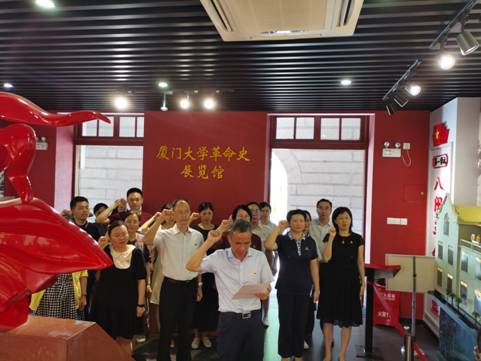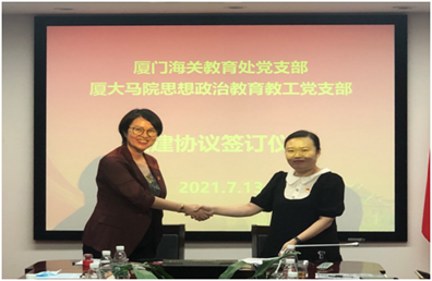 思想政治教育教工党支部书记苗瑞丹与厦门海关教育处党支部书记朱旭芳代表双方签约。仪式后,在侯利标书记的带领下,全体党员在厦门大学革命史展览馆重温入党誓词,庄严宣誓忆初心。