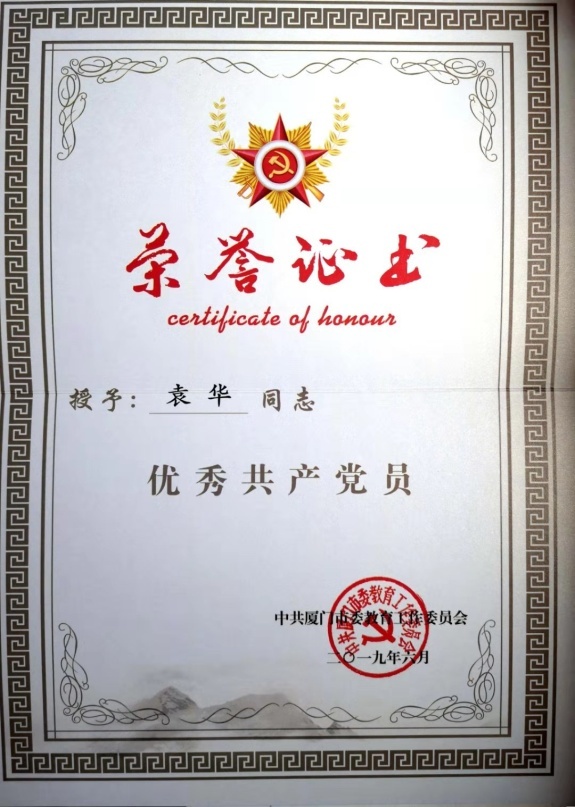 近日,中共厦门市委教育工委发文表彰先进党组织、优秀共产党员和优秀党务工作者,我院袁华副教授荣获“优秀共产党员”称号。