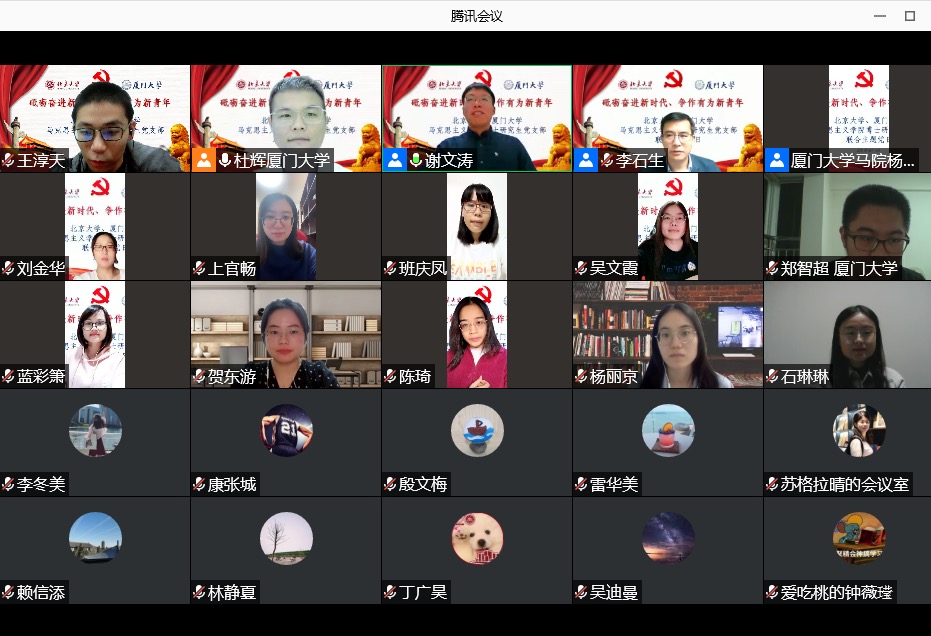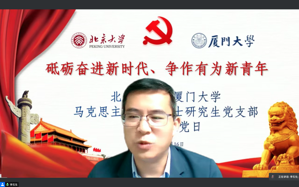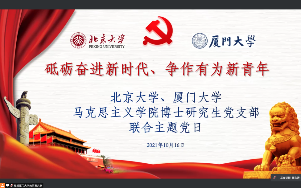 为搭建学生支部党建交流平台,同贺中国共产党成立100周年,以实际行动共庆厦门大学建校100周年、北京大学建校123周年,厦门大学马克思主义学院2020级博士研究生党支部与北京大学马克思主义学院2020级博士生1班党支部共同发起“砥砺奋进新时代、争作有为新青年”——学习习近平总书记“七一”重要讲话精神线上联合党日活动。
