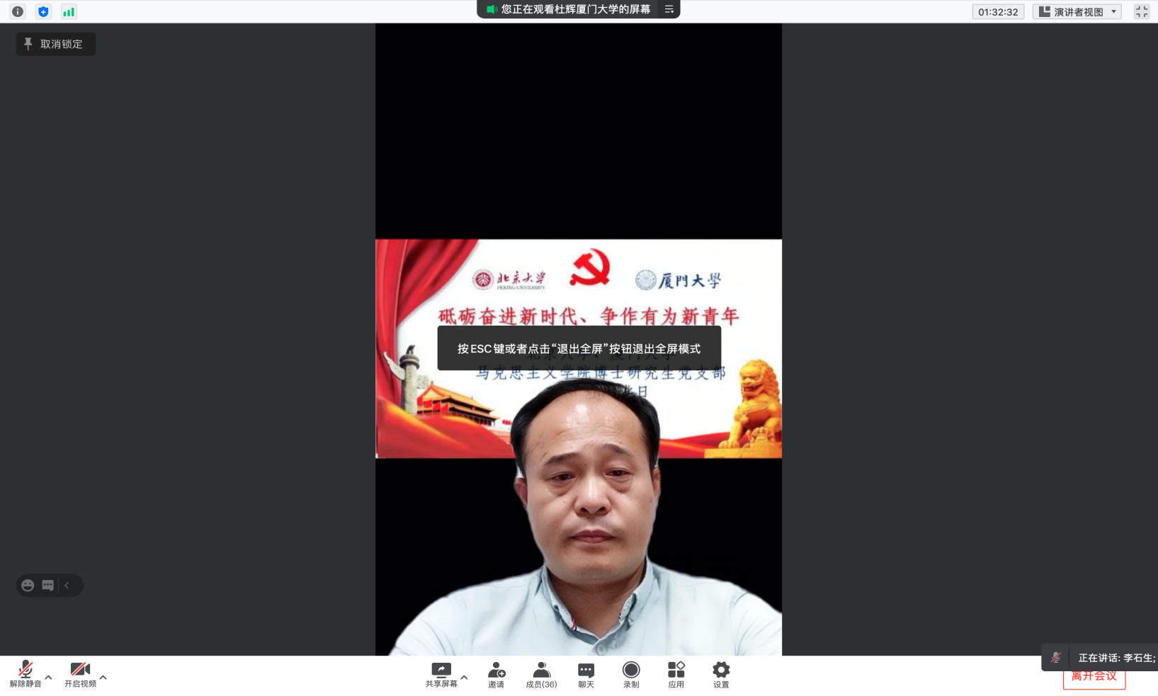 2021年10月16日晚,两支部同学们通过线上方式共同参加此次跨校联动的主题党日活动。活动由党支部书记杜辉(厦大)、谢文涛(北大)共同主持。学院党委副书记杨建中(厦大)、李石生(北大)作为嘉宾出席指导。