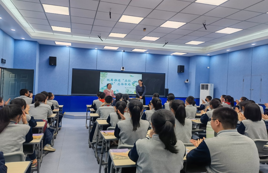 陈小芳以格局表情包为喻,引导学生感受“五位一体”总体布局在国家发展中的重要地位,通过结合中国特色社会主义建设过程的实际情况为学生梳理了“五位一体”总体布局的演进过程。在此基础上,陈小芳坚持贴近教材、贴近学生、贴近生活,以厦门在经济、政治、文化、社会、生态文明建设方面的成就入手,为学生重点讲解“五位一体”的指向目标。她号召同学们要在日常生活中具备大格局意识,做到想得更宽、思得更远。