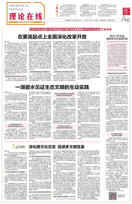 总之,改革开放是当代中国最壮丽的气象,推进改革,扩大开放,是当代中国发展的主旋律。改革不停顿,开放不止步,已成为引领厦门改革开放和特区建设的强大精神动力。在新征程上,我们要以习近平总书记致厦门经济特区建设40 周年贺信重要精神为指引,坚持中国特色社会主义道路,围绕全面深化改革开放、推动高质量发展、促进两岸融合发展等重点任务,坚决做到勇立潮头、勇毅前行,在更高起点上推进改革开放,努力率先实现社会主义现代化,为全面建设社会主义现代强国、实现第二个百年奋斗目标做出新的更大的贡献,以实际行动迎接党的二十大胜利召开。