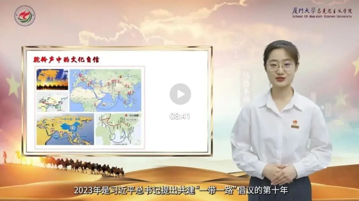 《驼铃声中的文化自信》主要围绕“一带一路”倡议提出十一周年的成就,剖析其所蕴含的文化意蕴,阐明了驼铃声中的文化自信的来源,以及声声驼铃得以生生不息的原因及其背后的大国主张;明晰“深厚的历史底蕴是我们的底气,有力的中国声音是我们的锐气,兼济天下的情怀是我们的志气”,从而弘扬中华优秀传统文化,推动构建人类命运共同体,为建设中华民族现代文明提供昂扬的精神动力。(指导教师:晏振宇副教授)