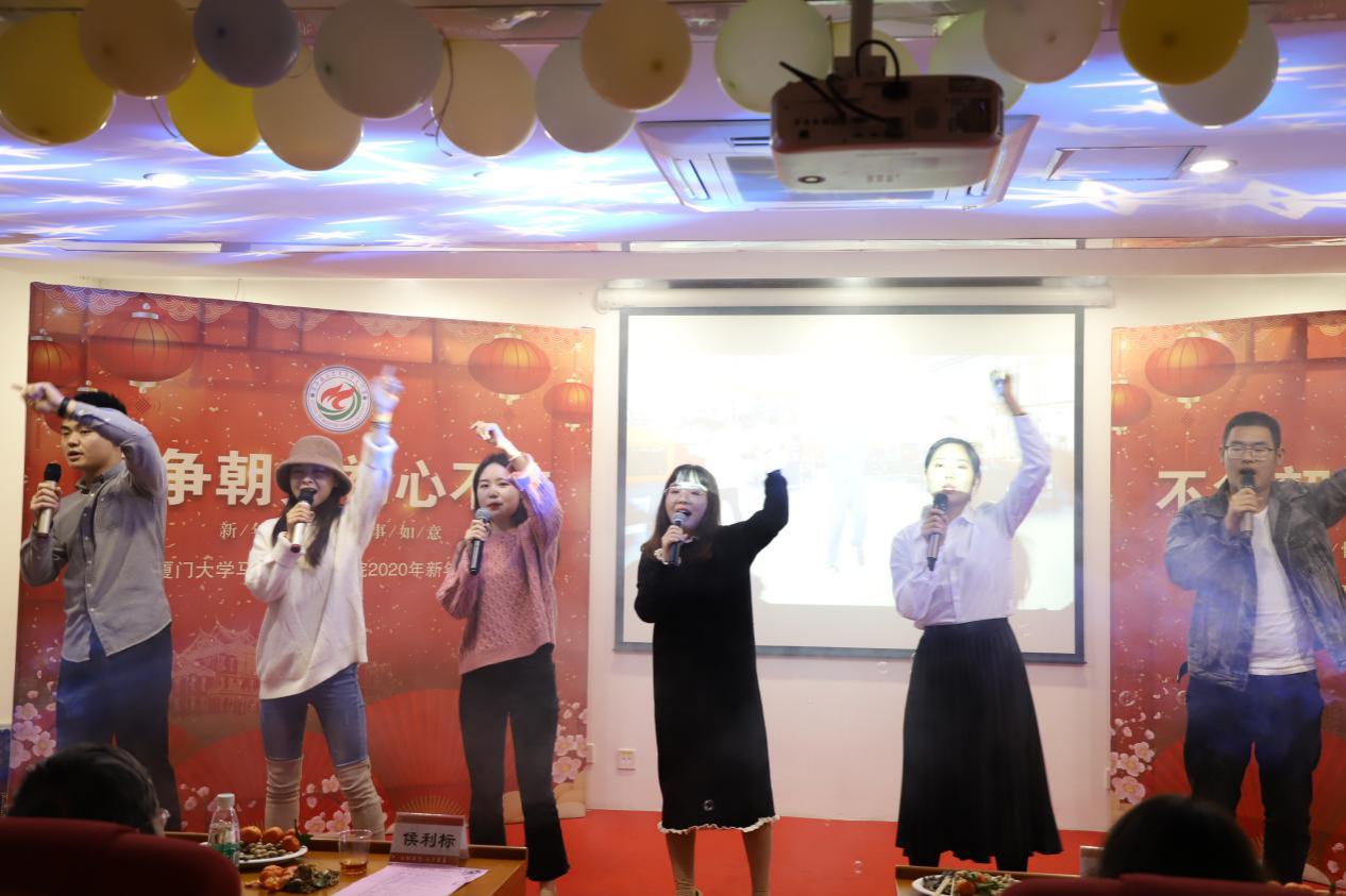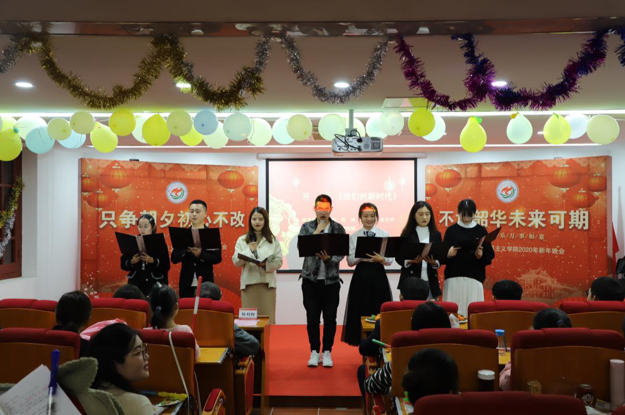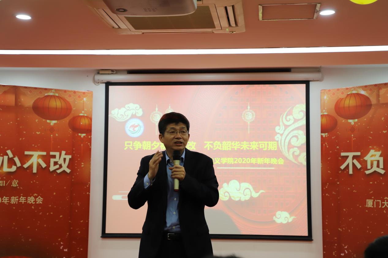2020年1月6日晚,囊萤楼313报告厅灯光璀璨,喜气洋洋,学院“只争朝夕初心不改,不负韶华未来可期”2020年新春晚会在此隆重举行。厦门大学党委常委、宣传部部长、马克思主义学院院长徐进功,院党委书记侯利标,常务副院长张有奎,党委副书记原宗丽以及各教研部教师代表和全院学生参加了晚会。晚会由2018级硕士研究生孔凡星和2019级硕士研究生姜澜主持。