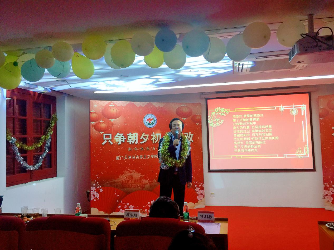 徐进功院长在热烈掌声中致开场辞。他首先回顾了学院在过去一年中取得的各项可喜成绩,代表学院领导班子向全院师生表示衷心感谢;他还展望了马院的美好未来,并为在场师生送上新年祝福。