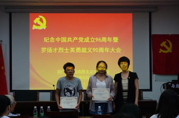 在团委书记蔡虎堂宣读有关表彰的决定后,曾炜琴老师、欧阳佑民副主任分别为获得厦门大学马克思主义学院2016-2017年度优秀学生共产党员、革命史展览馆优秀讲解员颁奖。其后优秀党员代表杜曼曼以及优秀讲解员代表宋尧、曹远东同学结合自己过去一年的学习、工作情况发言。三位同学发言表达了对党的忠诚、对革命先驱的敬仰,受到大家的一致好评。