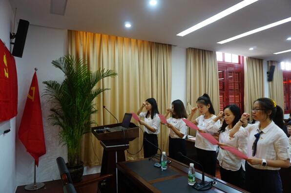 随后进入新党员宣誓环节,我院2015级研究生黄廷凤、张瑶、王晓宇与杨慧敏四位同学在2015级党支部书记王月同学领宣下,面对党旗庄严宣誓,并在誓词上郑重签下了名字。