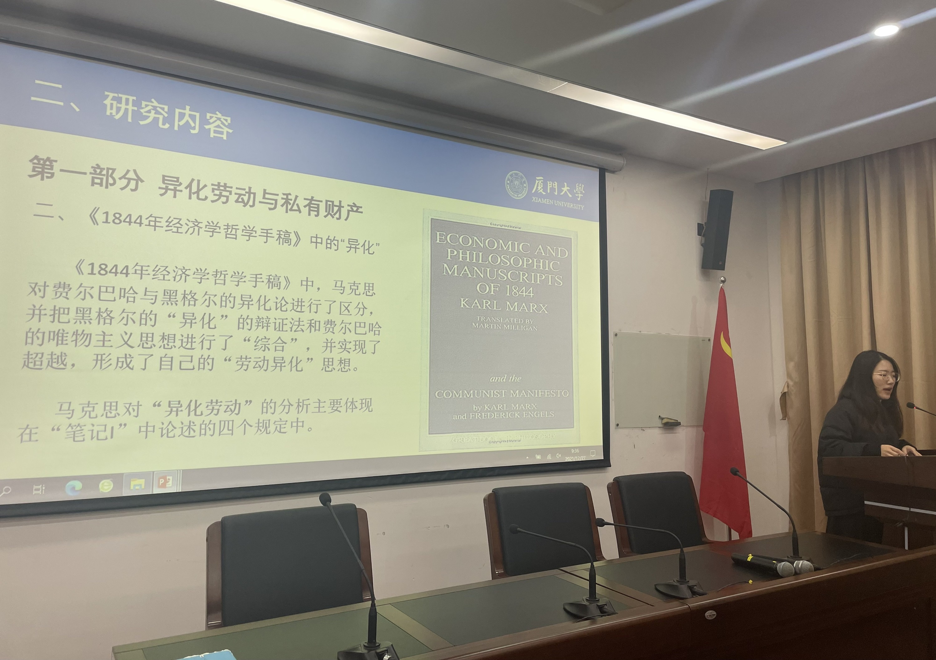 2021年12月27日上午,马克思主义学院第66期行知读书会在囊萤楼216会议室顺利举行。在庄三红老师的带领下,2021级硕士研究生共同研读经典文献《1844年经济学哲学手稿》中的“异化劳动与私有财产”以及“私有财产和共产主义”两部分内容,本次读书会由王一帆同学主持。