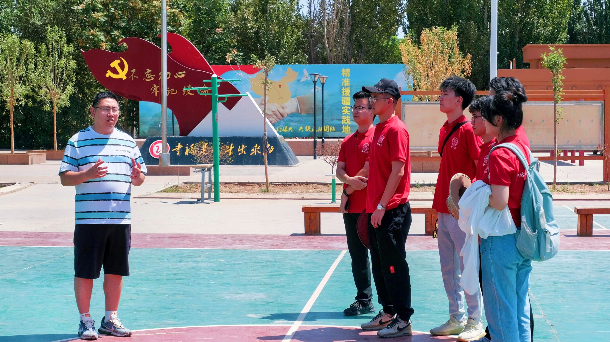 22日上午,实践队一行来到交河故城。交河故城展示了古代吐鲁番文明的兴衰,唐朝都护府、丝绸之路沿线城市文化、建筑技术、佛教及民族文化的交流与传播等,既体现着民族性和多样性,又体现着统一性和互补性。接着实践队一行来到了高昌区亚尔镇新城片区新城西门村。刚走进村庄,实践队师生们就被一条红色标语所吸引,“湘疆人民心连心”。原来,在吐鲁番市和湖南省援疆指挥部的积极推动下,2020年西门村与“全国脱贫攻坚楷模”十八洞村结对。近两年来,两个村携手共建民族团结和乡村振兴示范村,培育壮大特色产业,拓宽群众增收渠道,村容村貌焕然一新。站在红石榴广场上,肖斌老师向队员们讲解到:“天山脚下的古丽和湘江边上的细妹子有一个共同的国家,五十六个民族就要像石榴籽一样紧紧抱在一起,为实现社会主义现代化和中华民族伟大复兴凝心聚力。”
