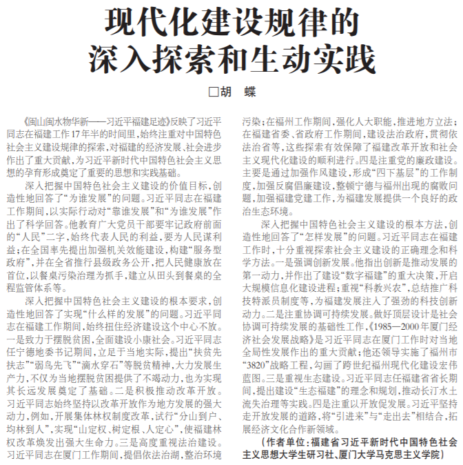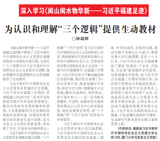 今年6月,由中央宣传部统筹指导,福建省委宣传部组织编写的《闽山闽水物华新——习近平福建足迹》一书出版发行。该书多角度客观记述了习近平同志领导、推动福建改革开放和现代化建设事业的施政故事,生动展示了习近平同志的信仰追求、为民情怀、思维方法、品格风范和非凡业绩,为全体师生在新时代伟大实践中更好担当作为提供了鲜活样本和学习典范。自《闽山闽水物华新——习近平福建足迹》出版以来,学院与有关单位协同合作,采取读书分享会、专题研讨和党支部理论学习等形式,开展该书的学习活动,迅速掀起学习宣传热潮。广大师生积极研学,撰写读书心得。8月2日及8月9日,《福建日报》理论周刊求是版分别刊发我院2021级博士研究生胡蝶的文章《现代化建设规律的深入探索和生动实践》和2020级硕士研究林超群的文章《为认识和理解“三个逻辑”提供生动教材》。