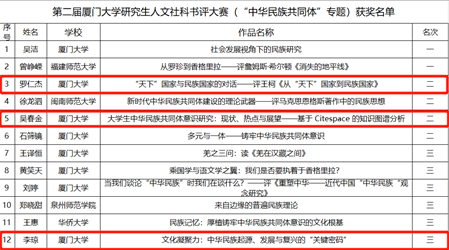 为推动深入学习贯彻习近平总书记关于民族工作的重要论述,传承党的百年光辉史基因,铸牢中华民族共同体意识,研究生院、马克思主义学院组织了面向我校及在闽其他高校在读硕博士研究生聚焦“中华民族共同体”专题的“第二届厦门大学研究生人文社科书评大赛”,以文促学,以文促行。经评审,我院硕士研究生罗仁杰、吴春金荣获二等奖,李琼荣获三等奖。