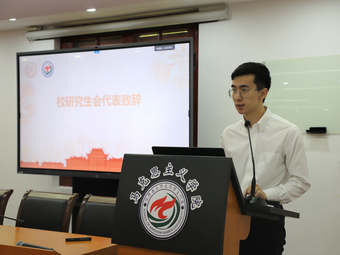 校研究生会代表李恩民发言,他对此次大会的召开表示热烈祝贺,指出研究生会应以“昂扬的斗志、奋发的精神、务实的作风、切实的行动”来加强自身建设,并表达了对马院研究生会蓬勃发展的衷心祝愿。