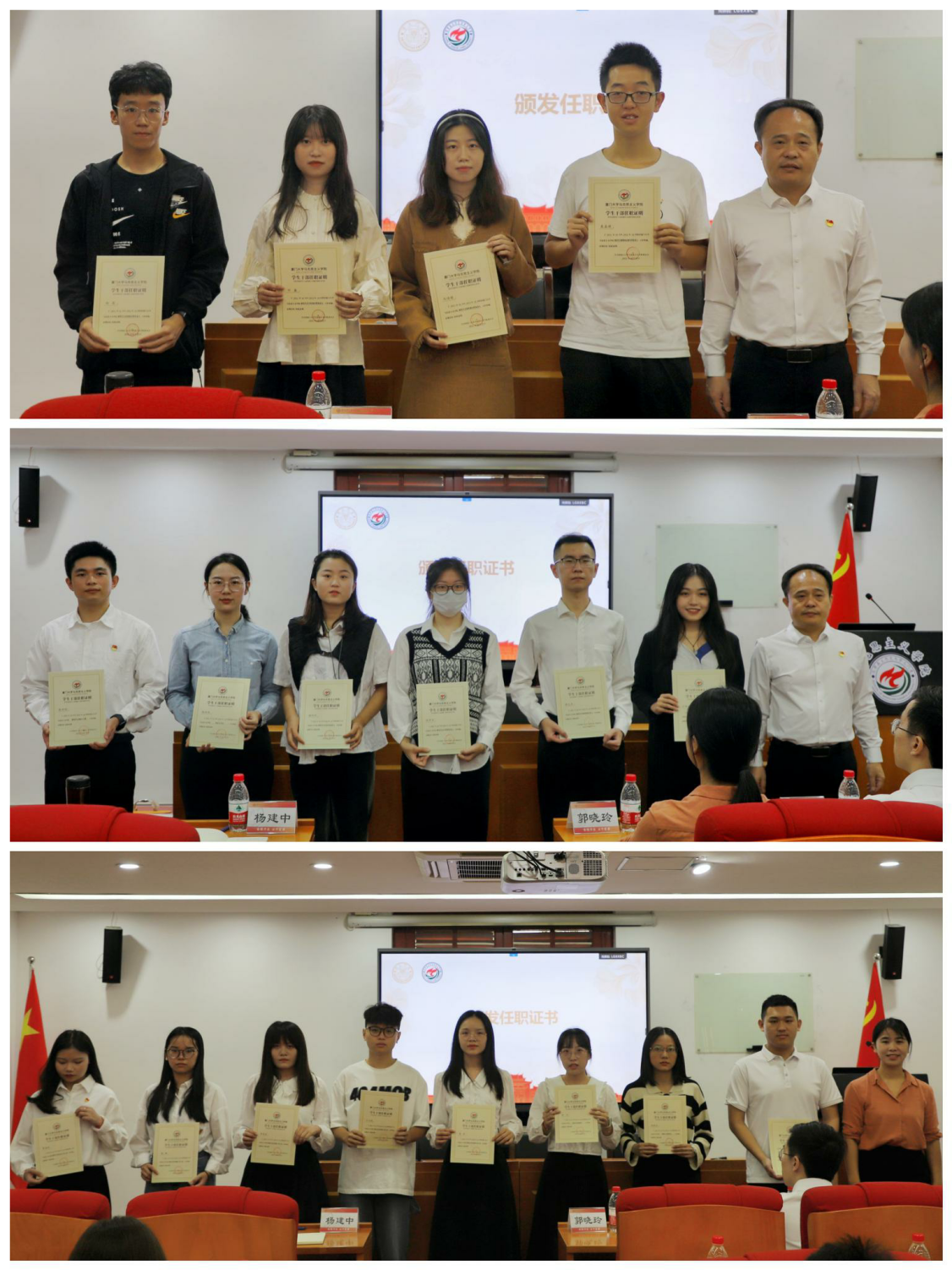 随后,杨建中老师和郭晓玲老师为第十届团总支、研究生会主席团、部门负责人、部门工作人员颁发聘用证书,并合影留念。
