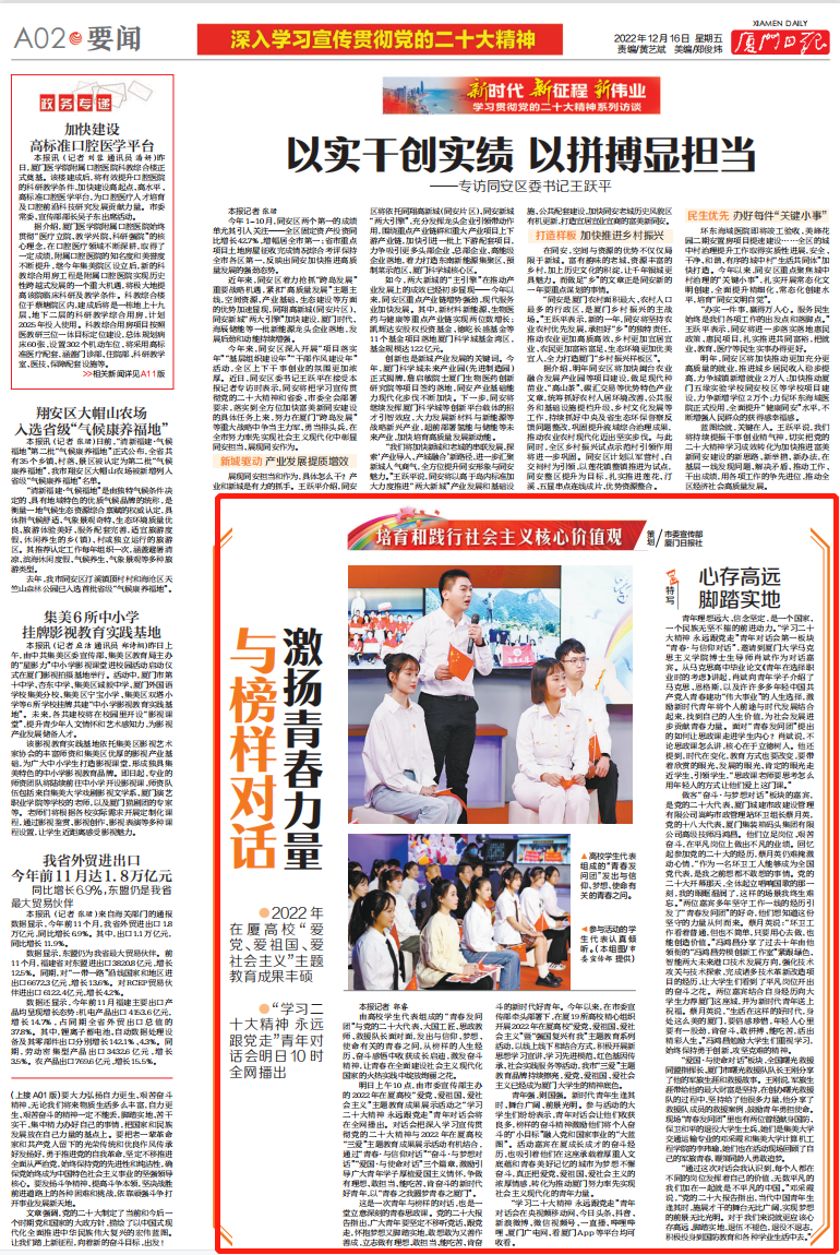 据悉,该活动将深入学习宣传贯彻党的二十大精神与2022年在厦高校“三爱”主题教育成果展示活动有机结合,联合央媒、厦门广电全媒体矩阵、门户网站等资源,进行全网宣传推广,组织在厦高校师生代表共话“新时代、新青年、新使命”,通过“青春·与信仰对话”“奋斗·与梦想对话”“爱国·与使命对话”三个篇章,激励引导广大青年学子厚植爱国主义情怀,把小我融入大我,争做有理想、敢担当、能吃苦、肯奋斗的新时代好青年。