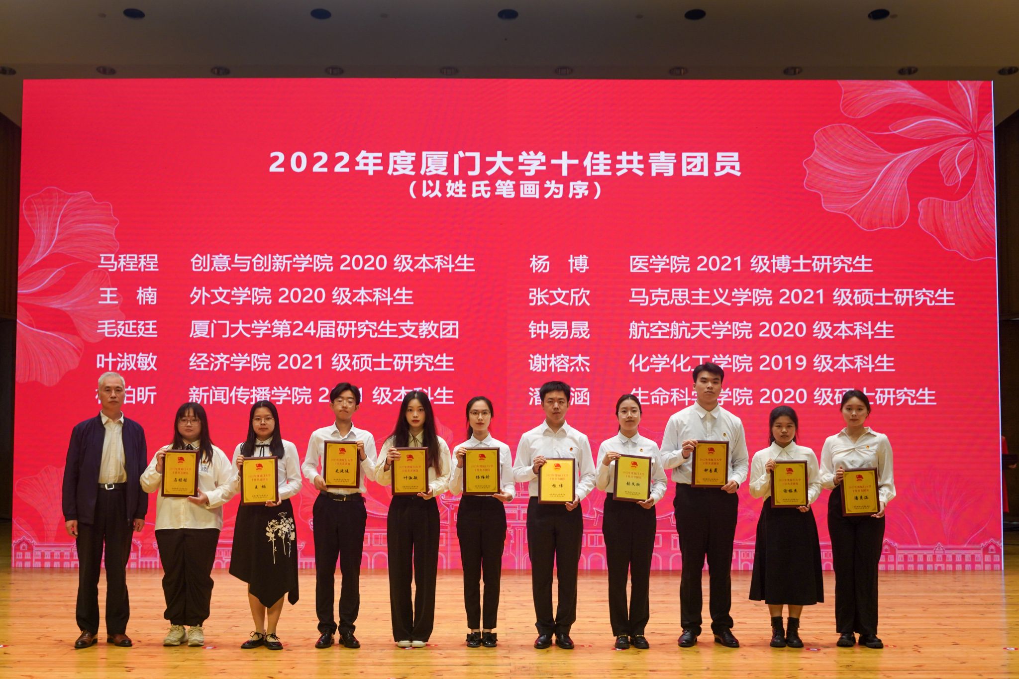 马克思主义学院在本次表彰中再获佳绩。学院2021级团支部荣获“2022年度厦门大学五四红旗团支部标兵”称号;2021级硕士研究生张文欣获评“2022年度厦门大学十佳共青团员”;2021级硕士研究生章温玲、黄吴葳获评“2022年度厦门大学优秀团支部(团总支)书记”;2020级硕士研究生张罗丹、2021级硕士研究生罗仁杰、2022级硕士研究生刘思明、2022级硕士研究生刘雨婷获评“2022 年度厦门大学优秀共青团员”。