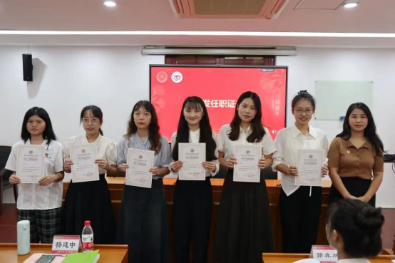 随后,杨建中老师和郭晓玲老师为第十一届团总支、研究生会主席团、部门负责人颁发聘用证书,并合影留念。